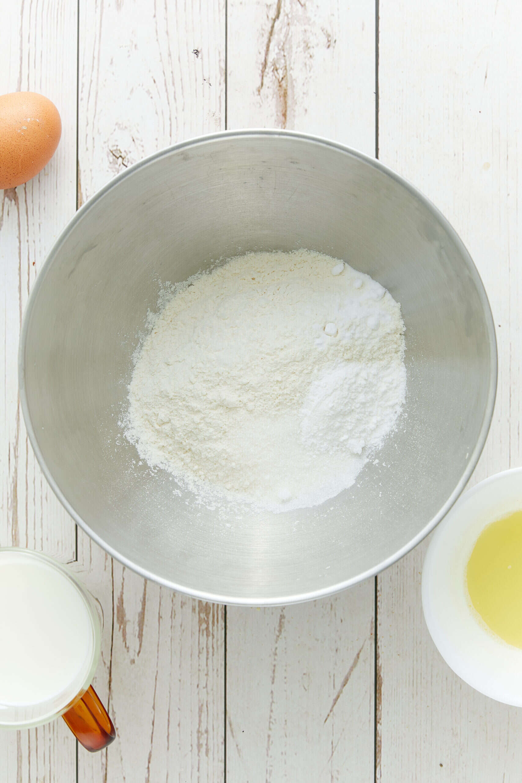 In a large bowl, whisk together all-purpose flour, granulated sugar, baking powder, baking soda, and salt.
