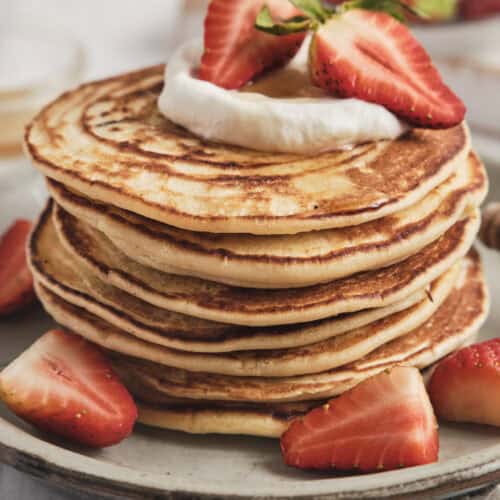 Let your pancakes cool to room temperature, and then wrap them in plastic or transfer them to an airtight container. Refrigerate them for up to 1 week. If you freeze them, make sure to separate each pancake with parchment so they don’t stick together. Then thaw them in the fridge overnight before reheating the next morning. To reheat, simply warm them up in the oven at 350°F for 5-8 minutes.