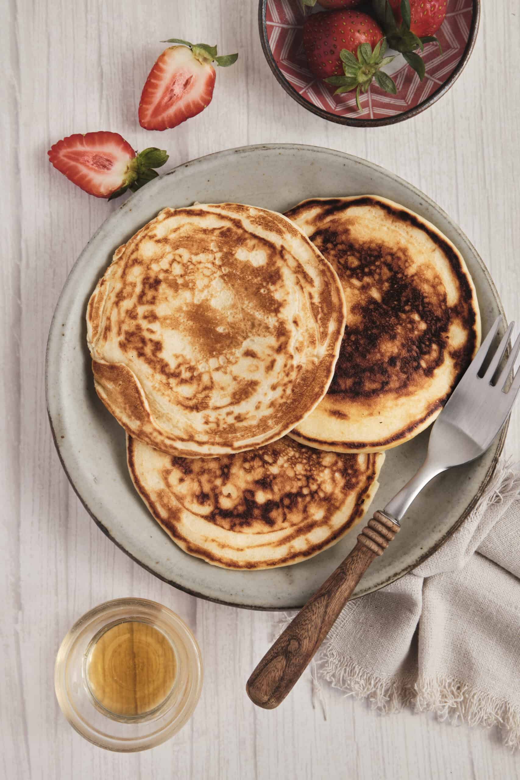 Now, these classic pancakes aren’t the thickest out there, but they also aren’t paper-thin like a crêpe. They’re in that Goldilocks zone of “just right,” with a tender inside and buttery brown outside. With a drizzle of maple syrup and your other favorite toppings, these pancakes are perfect for big brunches or intimate mornings with your family. However you like to dish them out, these pancakes are designed to never disappoint!