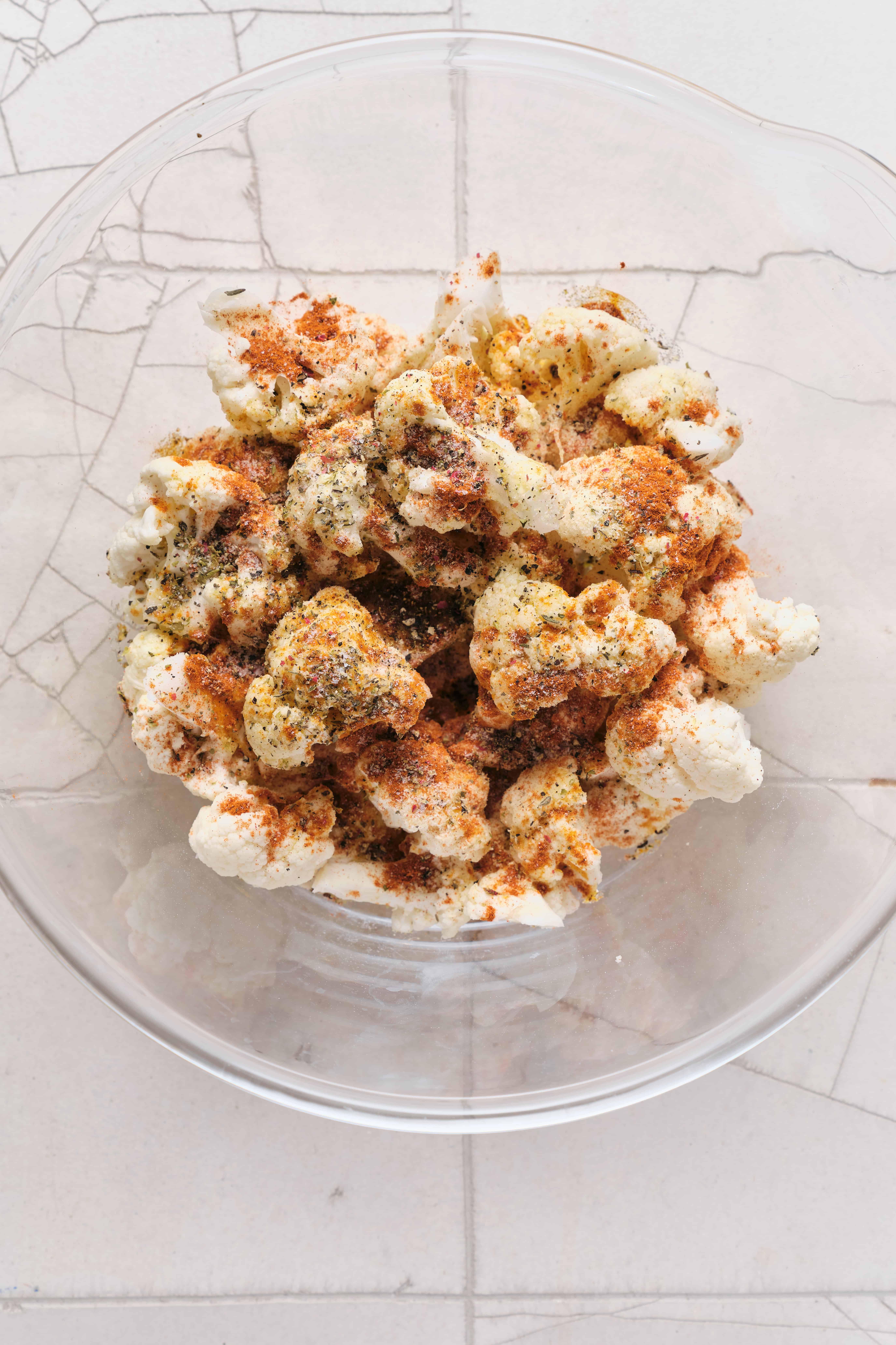 In a large bowl, toss the cauliflower florets with olive oil, paprika, salt, black pepper, onion powder, and Italian seasoning until they are evenly coated.