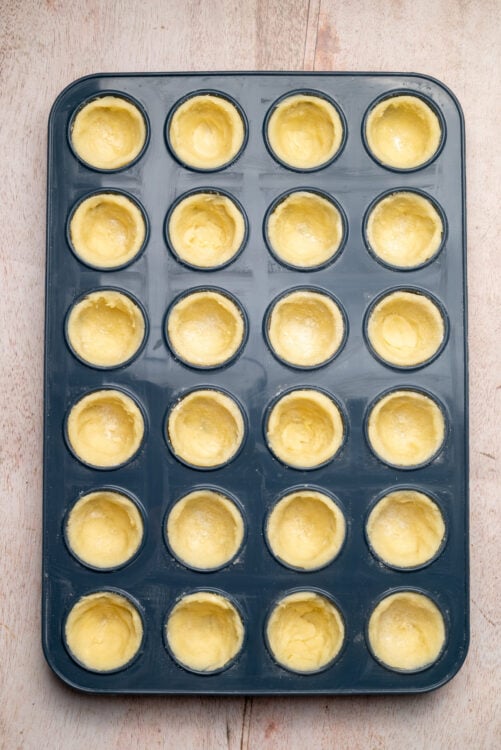 Cover the dough with plastic wrap and refrigerate for about 30 minutes so it can firm up. Divide the dough into 48 equal pieces. Press each piece into the mini muffin cups to form tart shells that line the bottom and sides. Place the pan in the refrigerator and chill for about 1 hour.