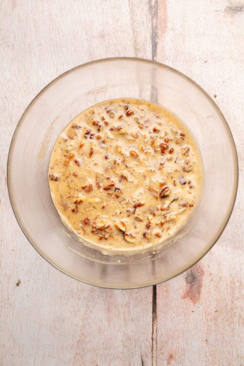 In a separate bowl, whisk together the brown sugar, eggs, melted butter, vanilla extract, and salt. Stir in the chopped toasted pecans.