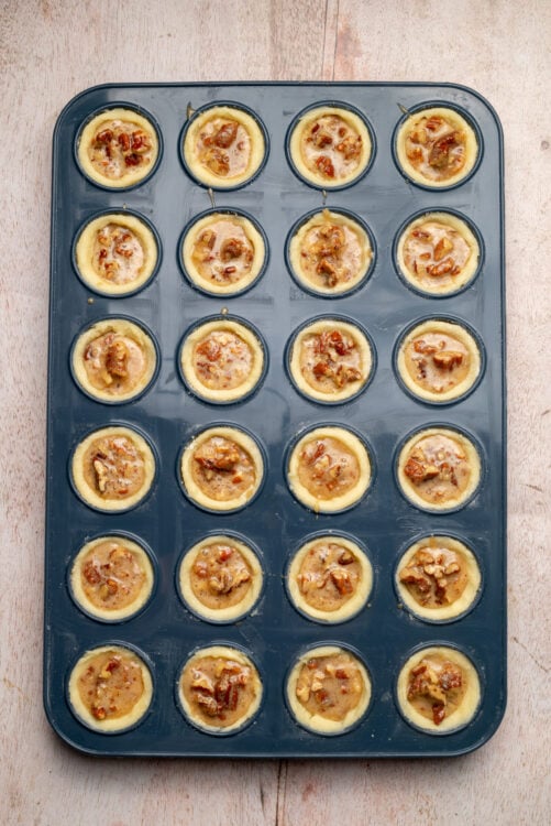 While the two desserts do taste similar enough to be comparable, there are some distinct differences, especially in the crust. Traditional pie crust is made with a blend of flour, sugar, salt, butter, and ice water. Pecan tassies, on the other hand, have tart shells made with butter, cream cheese, vanilla extract, and flour. This yields a richer, denser crust that makes each bite extra buttery, instead of flaky like classic pie crust.