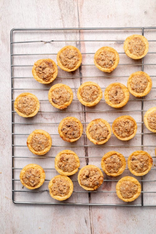 Once your pecan tassies are at room temperature, transfer them to an airtight container. At room temperature, they’ll last for 4-5 days. Otherwise, transfer them to a freezer-safe container and freeze them for up to 3 months. Then, you can thaw them in the fridge overnight before warming them in a toaster oven for 5 minutes, or a microwave for 30-60 seconds.