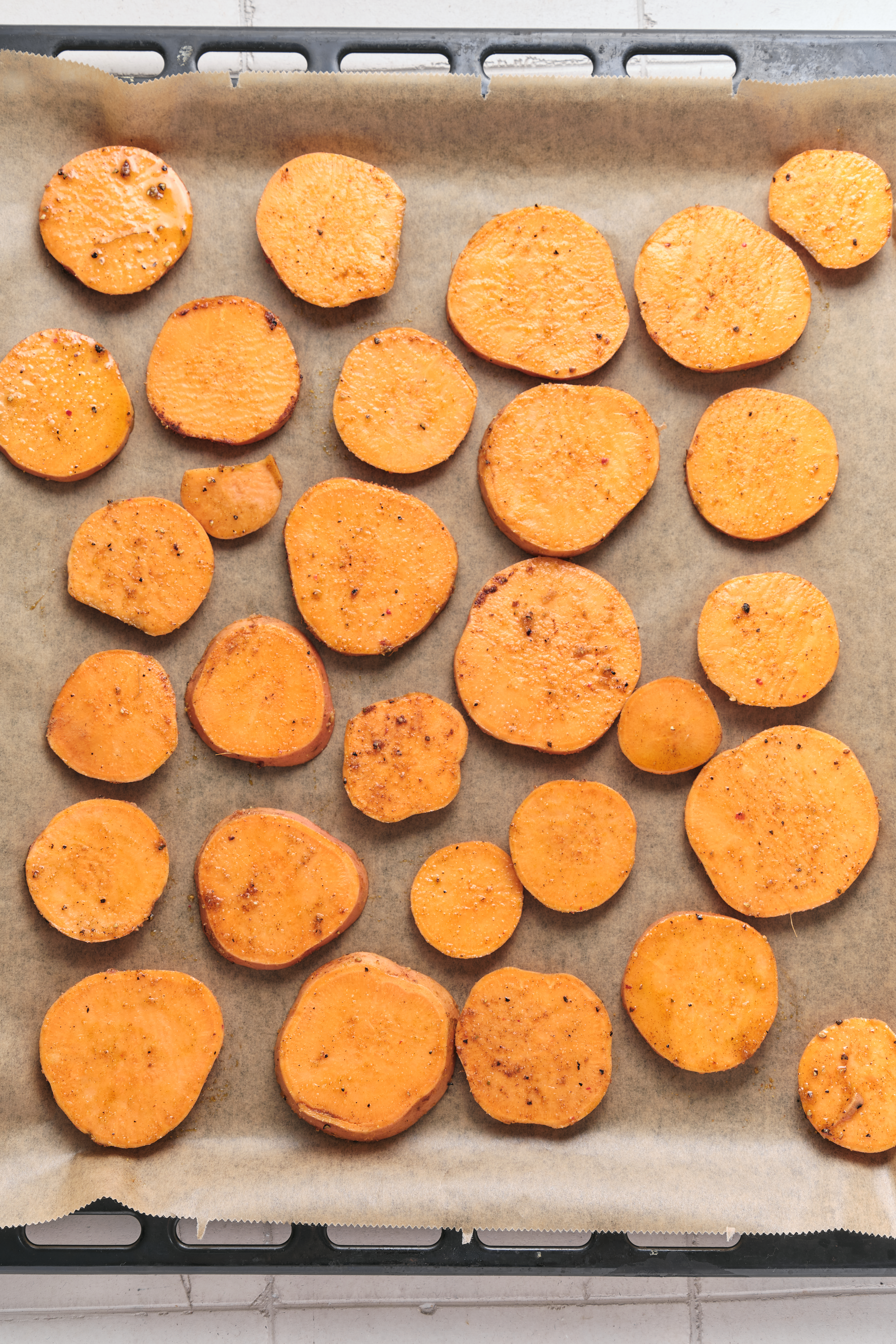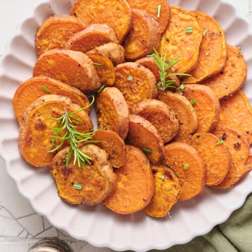 Once your sweet potato slices have cooled to room temperature, transfer them to an airtight container. Refrigerate them for 4-5 days, or freeze them for up to 2 months before thawing in the fridge overnight. Reheat in the oven at 350°F for 10-15 minutes, until they reach your ideal level of crispiness.