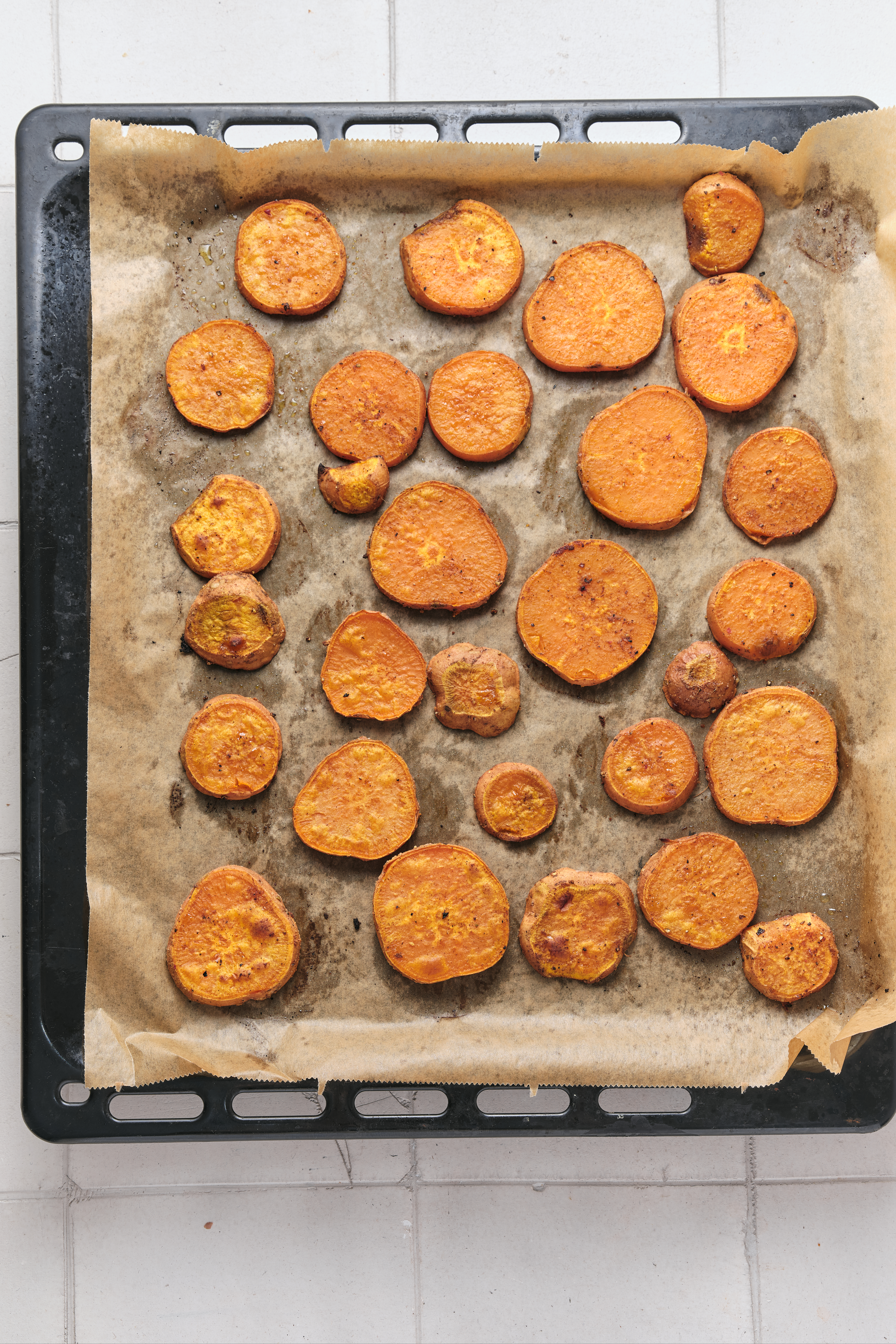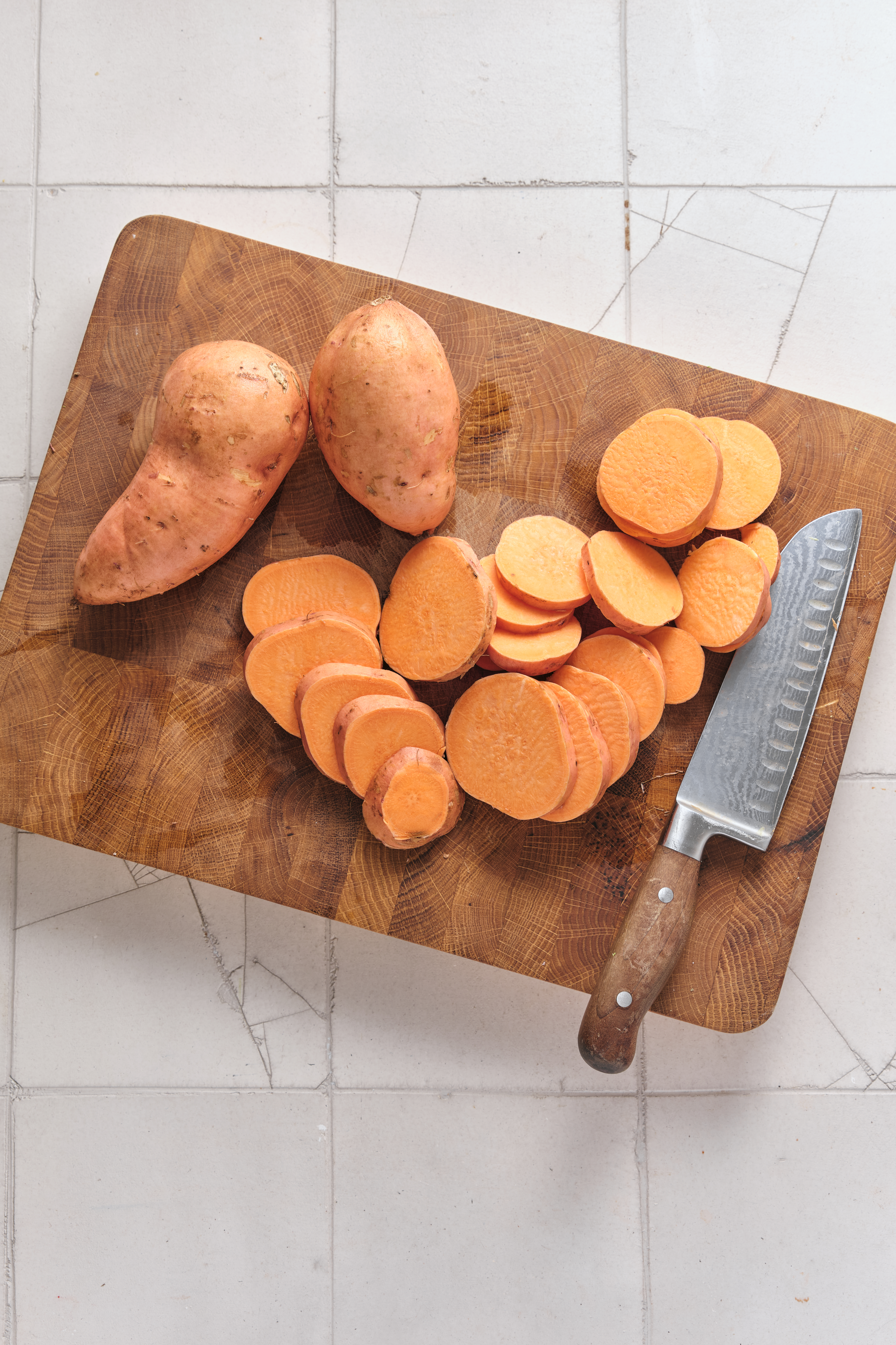 Wash and dry the sweet potatoes. Slice them evenly into 1/2-inch rounds to ensure even cooking.