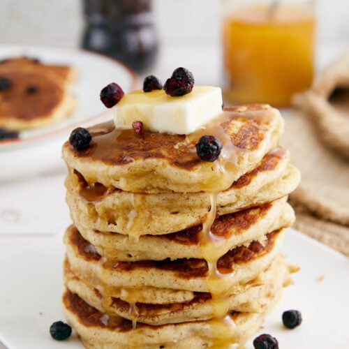 Let your whole wheat pancakes cool to room temperature, and then transfer them to an airtight container. Refrigerate for 3-4 days, or freeze them for up to 3 months with parchment paper between each pancake. Before reheating, thaw in the fridge overnight. Heat them up in a pan on the stove with some butter, or place them on a plate and cover them with a moist paper towel, then microwave for 1-2 minutes. Ideally, pancakes should be stored without toppings so they stay as fresh—and not soggy—as possible.