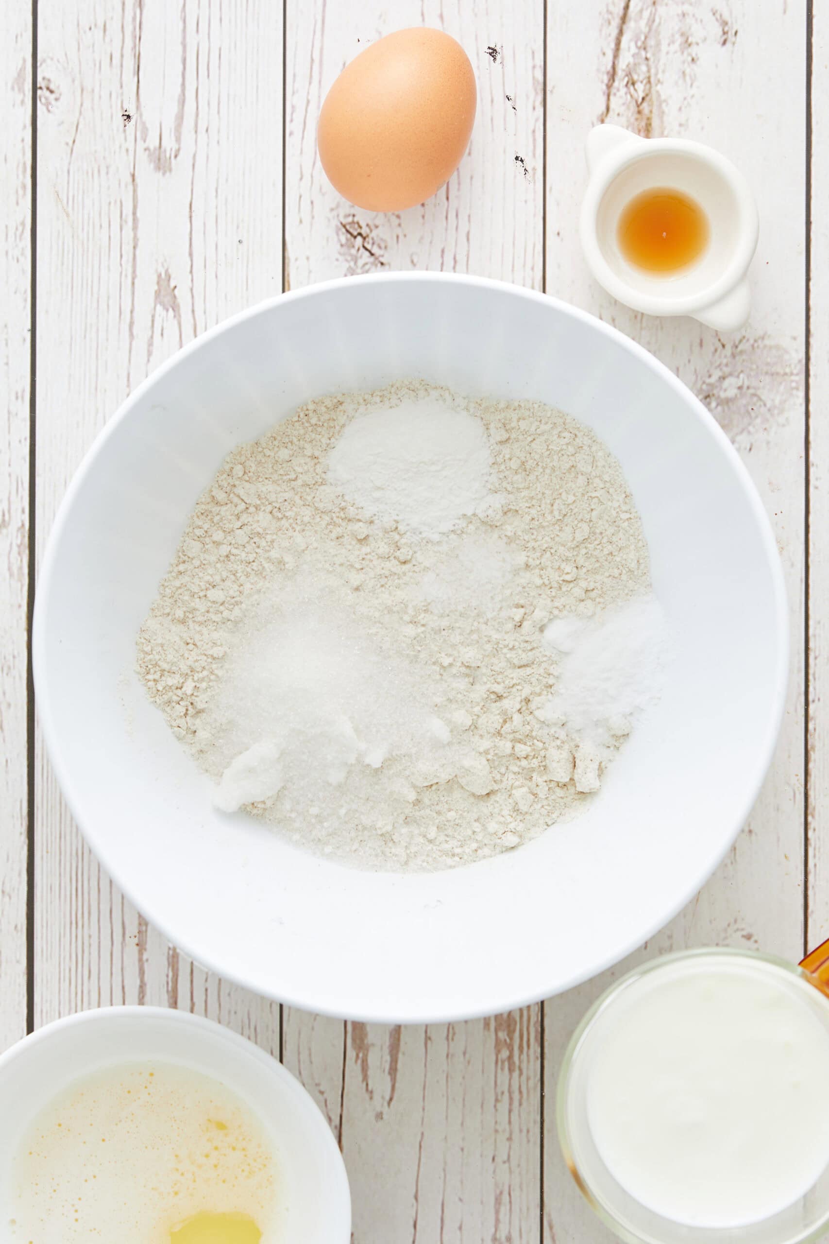 In a large bowl, whisk together the whole wheat flour, sugar, baking powder, baking soda, and salt.