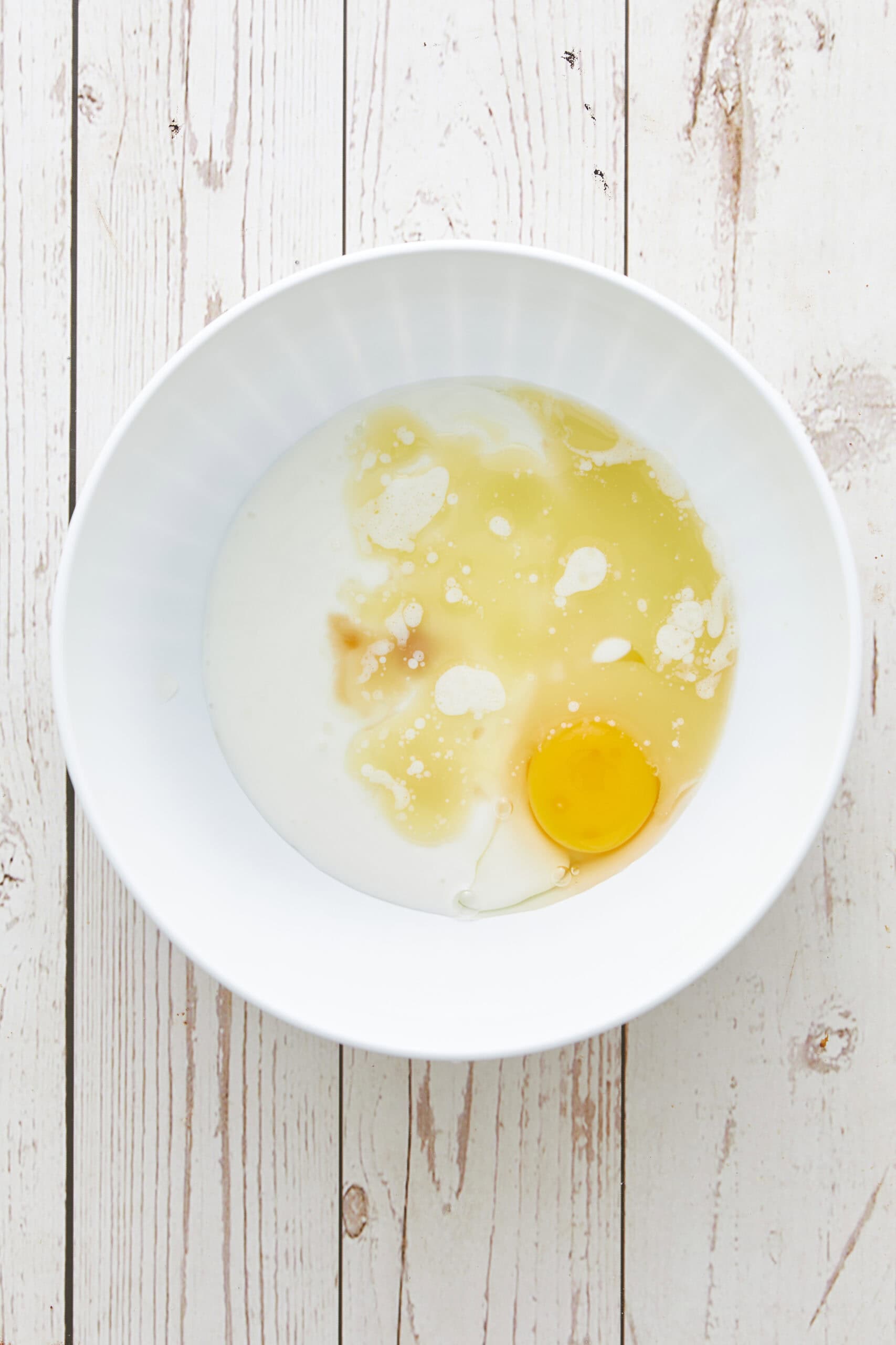 In another bowl, beat the egg and then whisk in the buttermilk, vanilla, and melted butter until well blended.