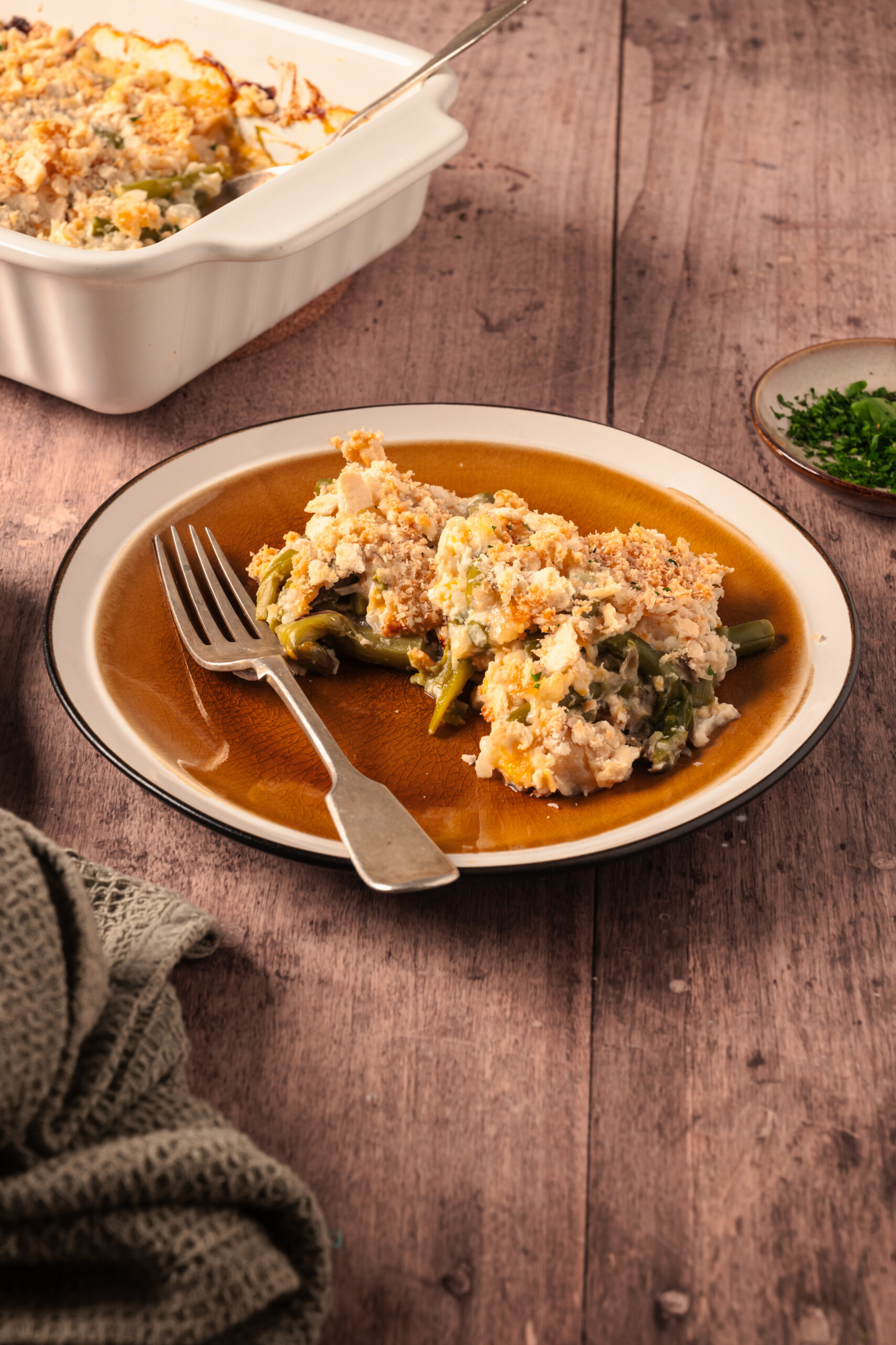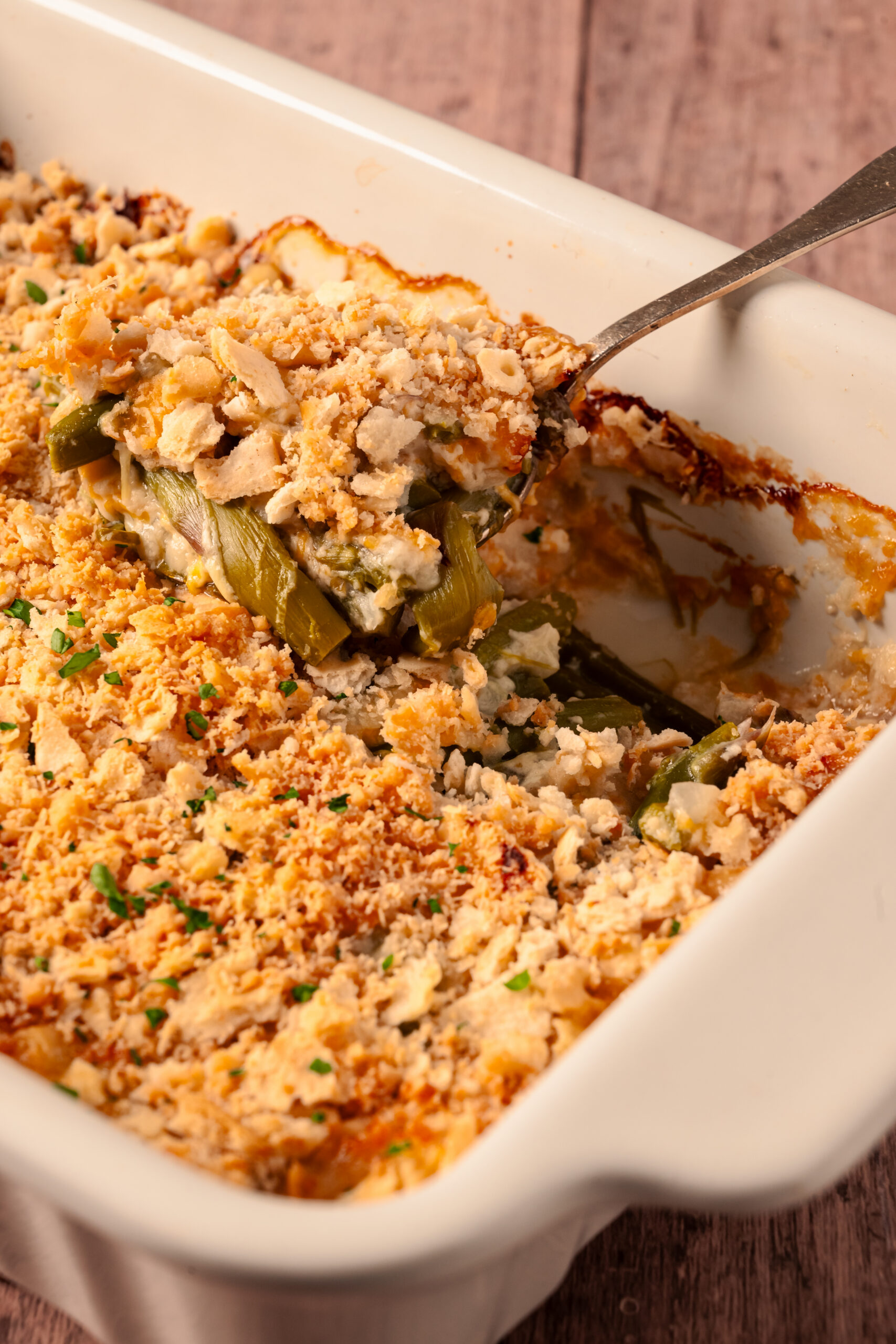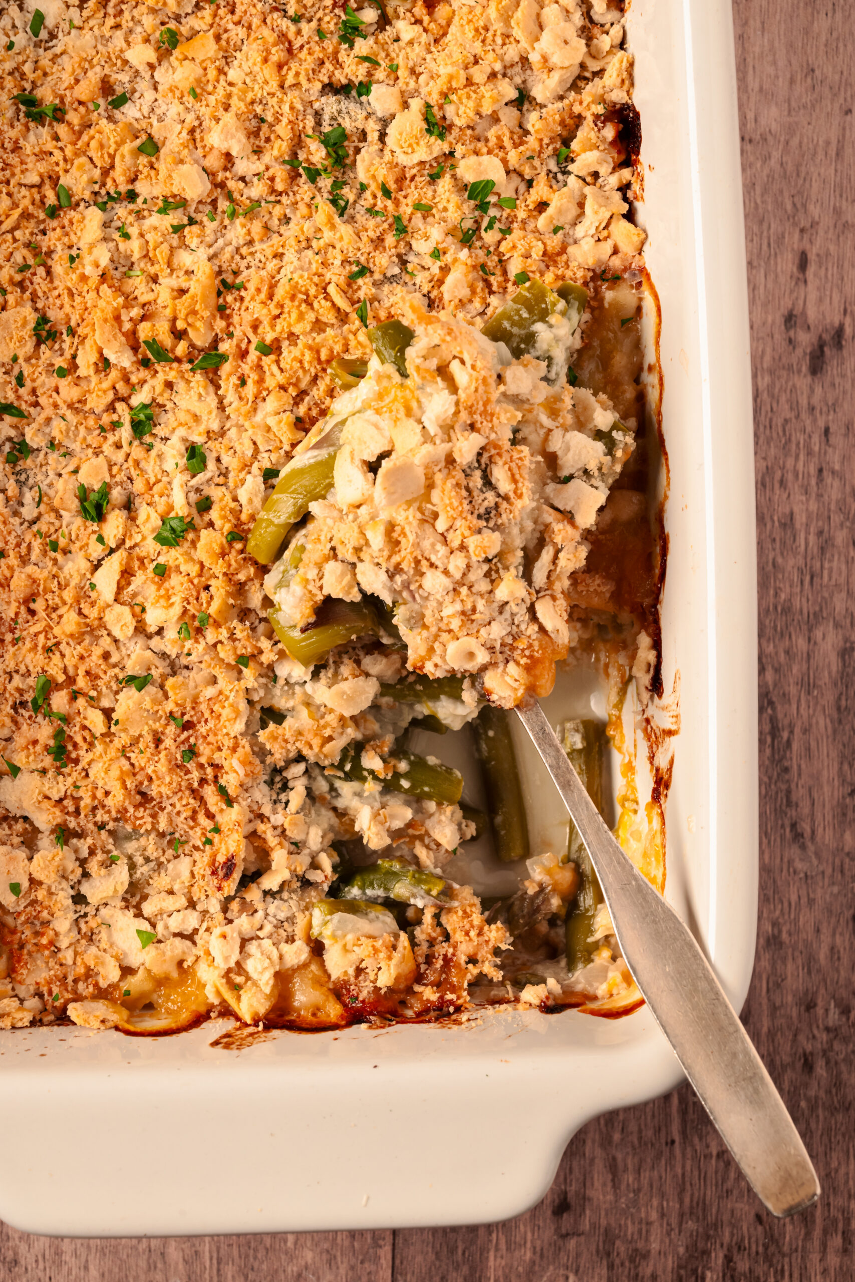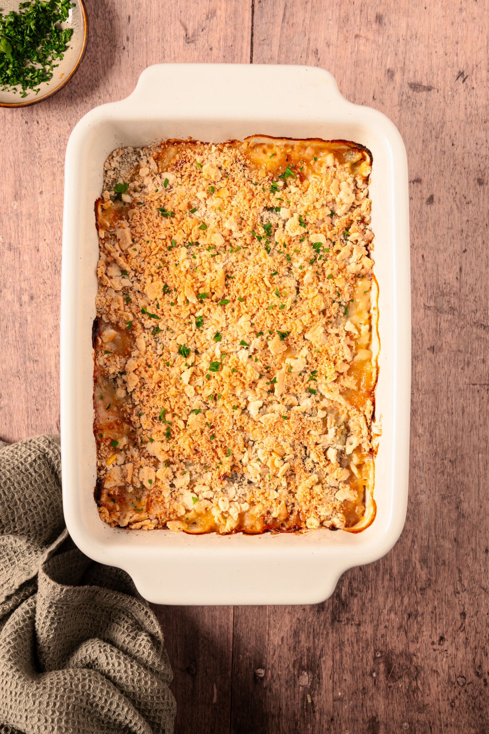 Allow the casserole to cool slightly before serving. Garnish with fresh parsley.