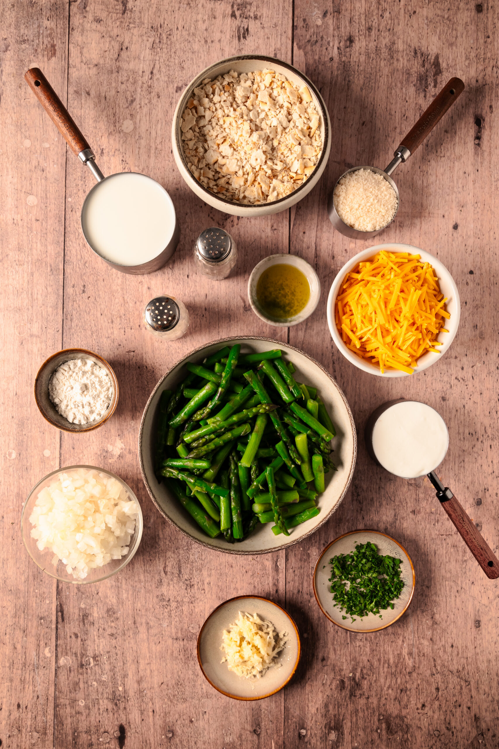 In all my experience with preparing fresh produce, asparagus has given me the most trouble. Why? Because certain parts of these green spears are too tough to eat easily, and they can ruin a whole meal if included by accident. So I recommend that you remove the woody stem of the asparagus so that each bite of this casserole is tender and enjoyable—not stringy. It’s also important to cut the asparagus tops into two-inch pieces so that they’re smoothly incorporated into the casserole. With all that in mind, you’ll have no problem crafting a satisfying dish full of green goodness.
