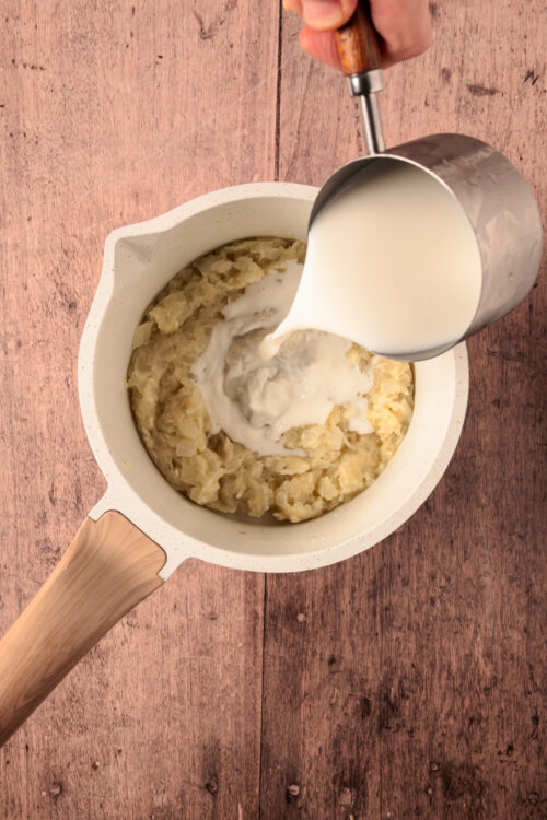 Sprinkle in the flour and stir for 1 minute. Slowly whisk in the low-fat milk, stirring constantly until the sauce thickens. Season with salt and pepper to taste.
