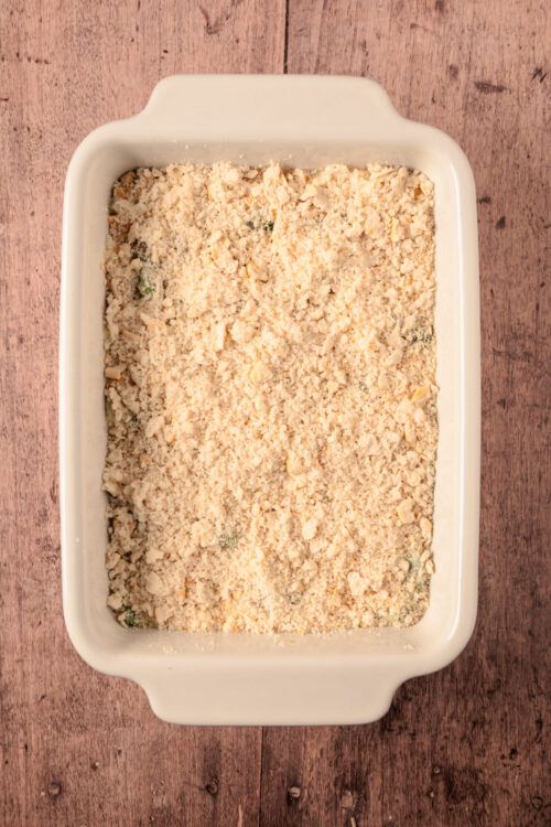 Transfer the mixture into a lightly greased 9×13-inch baking dish. Evenly sprinkle the crushed crackers and Parmesan over the top.