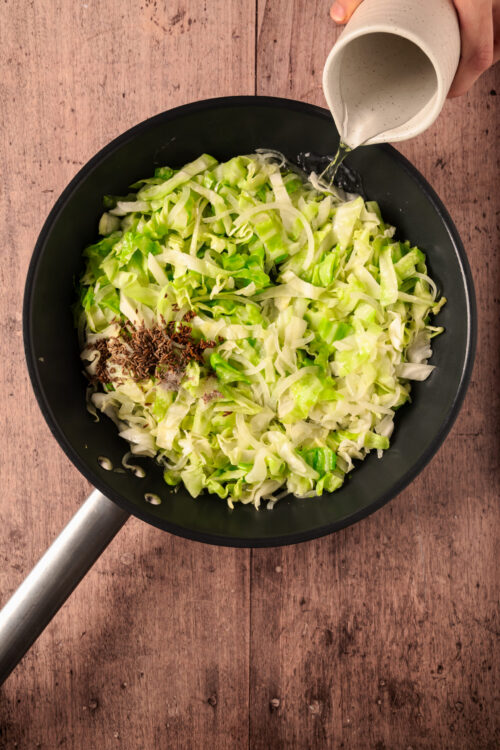 Stir in water, vinegar, sugar, caraway seeds, and salt. Reduce the heat to low, cover the skillet, and cook, stirring occasionally, until the cabbage is tender, about 20-25 minutes.