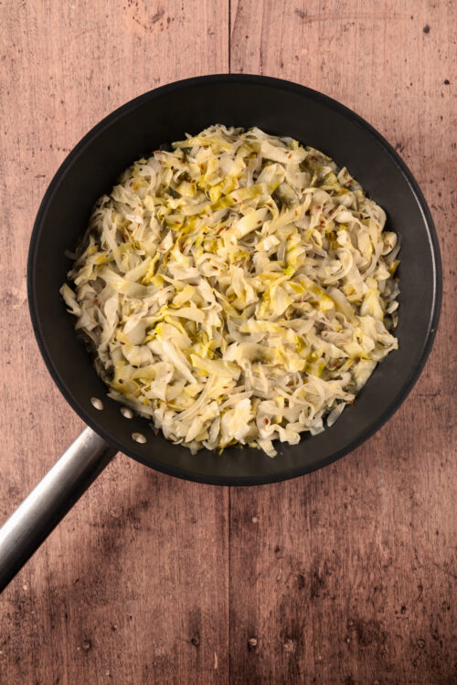 Although raw cabbage tastes bitter and crunchy, it wilts beautifully when cooked, sweetened by aromatic seasonings. Mixed together with delicate onion slices and minced garlic, braised cabbage is the ideal savory companion dish for all kinds of mains. As a succulent side, it shines bright next to steak and potatoes. As a topping, it goes great on pasta. I’ve also seen people top their braised cabbage with smoky bacon bits to enliven the whole dish. However you choose to play with it, braised cabbage is a dazzling little dish that every chef ought to have up his or her sleeve.
