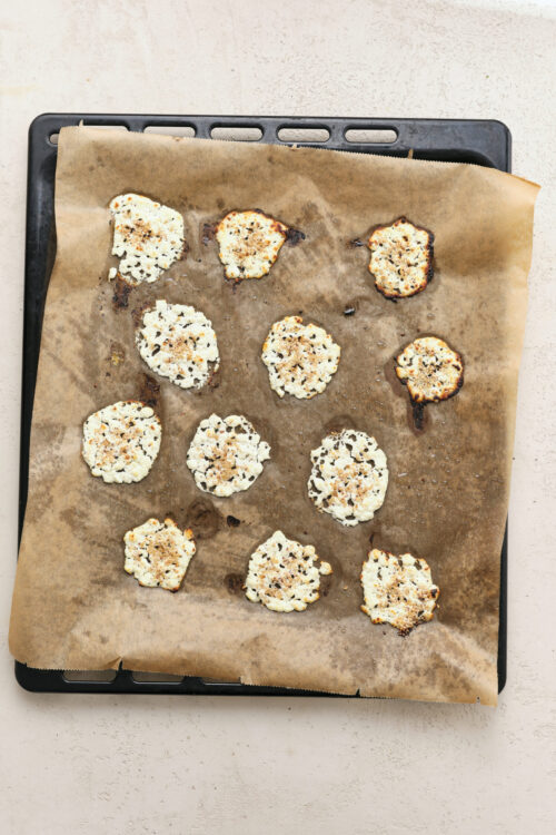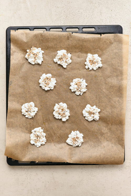 Using a tablespoon, drop portions of the drained cottage cheese onto the prepared baking sheet, spacing them about 2 inches apart. Use the back of a spoon to gently flatten each mound to form thin, round chips. If using, sprinkle each mound with everything bagel seasoning.