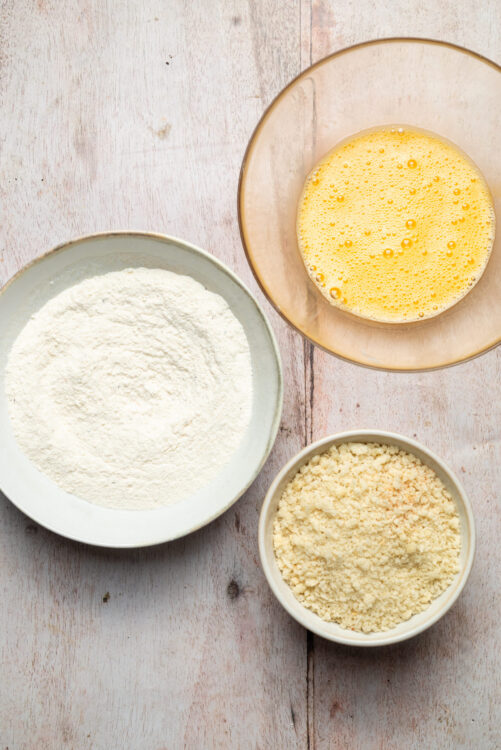 In one shallow bowl, mix the flour with salt, pepper, and cayenne. In a second bowl, beat the eggs. Place the panko breadcrumbs in a third bowl.