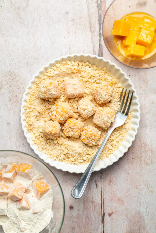 Dip each cheese cube first in the flour mixture, then in the egg, and finally in the panko. Gently press to help the breadcrumbs stick. For a thicker coating, you can double-bread them.
