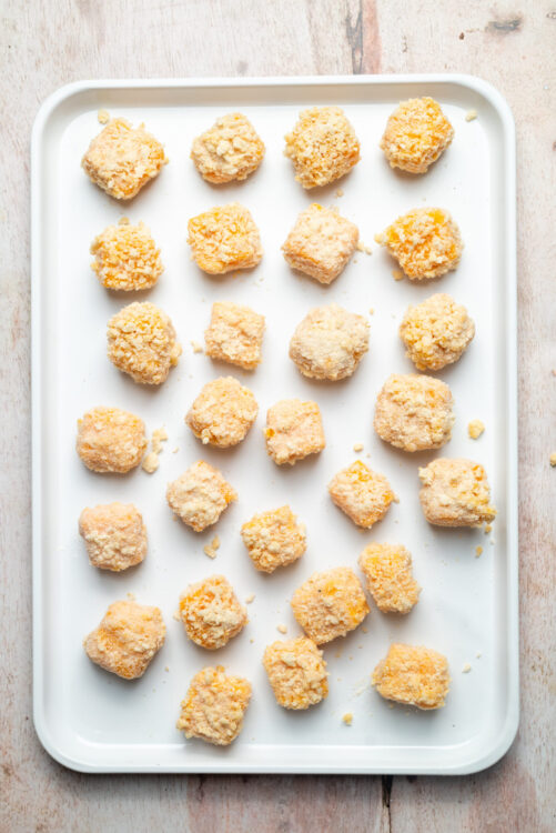 Place the breaded cheese cubes on a tray lined with parchment paper and freeze them for 20-30 minutes. This step ensures the coating stays intact during frying.