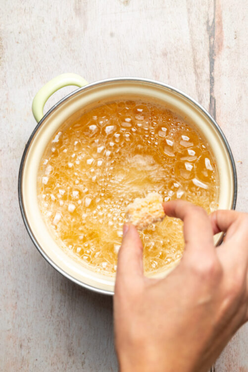 Heat vegetable oil in a deep pan to about 375°F. Fry the chilled cheese cubes in small batches for roughly 3 minutes until the coating is golden and crisp.
