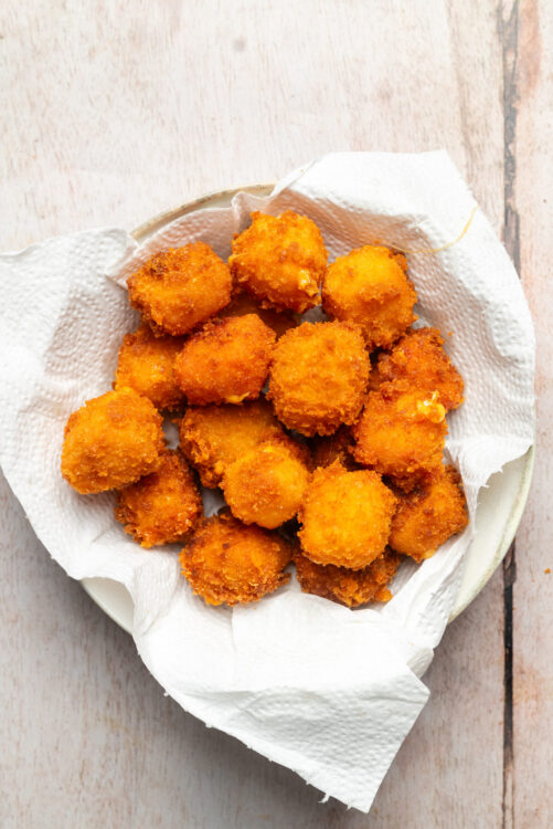 With a lower melting point than many firmer cheeses, cheddar is best fried after it’s been chilled in the freezer for around 30 minutes. So, to avoid any cheese oozing out of the breading while frying, make sure it’s cold first. This will help the cheese cubes stay solid until you pull them apart with that first satisfying bite.