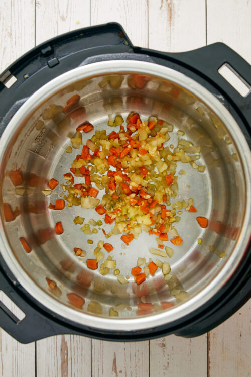 Turn on the Instant Pot's 'Sauté' function. Add olive oil, then carrots, celery, and onion. Sauté for about 3-5 minutes until they start to soften.