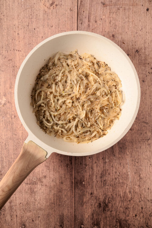 Melt the butter in a large frying pan over medium heat. Add the sliced onion and dried thyme. Cook for 2-3 minutes until the onion softens. Then add the minced garlic and stir for about 30 seconds. Remove the onions from the pan and set aside.