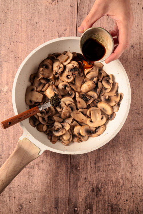 Drizzle the olive oil into the pan and increase heat to medium-high. Add the sliced mushrooms in a single layer. Cook without stirring for 1-2 minutes to help them brown. Stir in the Italian seasoning and balsamic vinegar and continue cooking for another 4-8 minutes, until the mushrooms reduce in volume and most of the liquid evaporates. Allow the mushrooms to brown slightly by avoiding stirring for a brief moment.