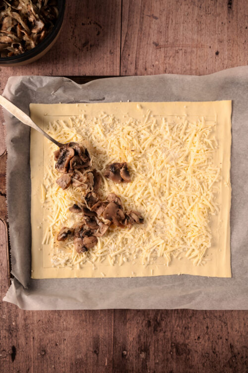 Prick the center of the dough with a fork a few times to prevent it from puffing up too much. Sprinkle the shredded Gruyère cheese and Parmesan cheese evenly over the pastry, and then spread the cooled mushroom mixture on top.