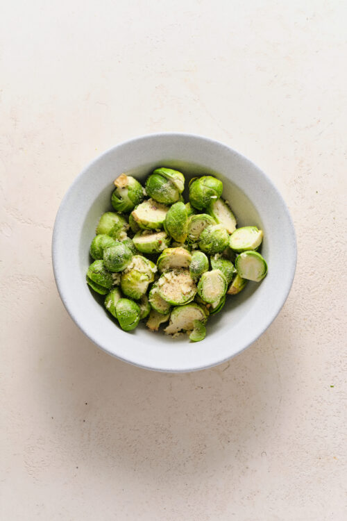 In a bowl, toss the Brussels sprouts with olive oil, salt, pepper, onion powder, and minced garlic if using.