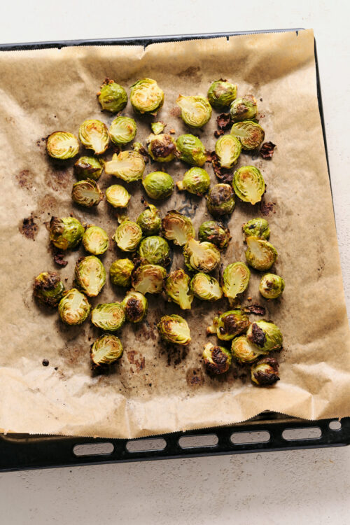 Let your roasted Brussels sprouts cool completely to room temperature before transferring them to an airtight container. Refrigerate them for 3-4 days or freeze them in a freezer-safe container for up to 3 months. Thaw them in the fridge overnight before reheating in the oven at 300°F for 10-15 minutes. You can also reheat them in the air fryer for 5-10 minutes instead.