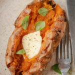 Complete your meal with a buttery baked sweet potato that’s crispy on the outside and fluffy on the inside.