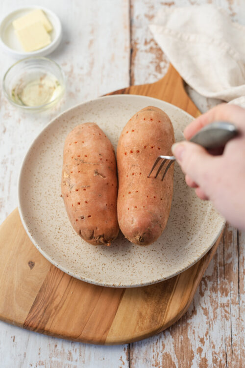Preheat your air fryer to 400°F. Wash and dry the sweet potatoes thoroughly, then use a fork to poke holes all over each potato.