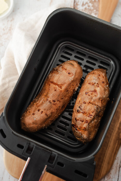 Remove the sweet potatoes from the air fryer and let them cool for a few minutes. Slice them open and fluff the insides with a fork. Serve with butter or any extra toppings you enjoy.