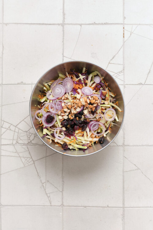 Place the broccoli slaw mix in a large bowl and add the chopped red onion, almonds, and dried cranberries.