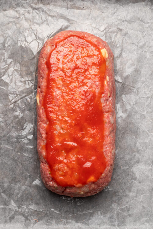 Shape the meat mixture into a loaf on a baking sheet lined with parchment paper. Spread the remaining ketchup on top.