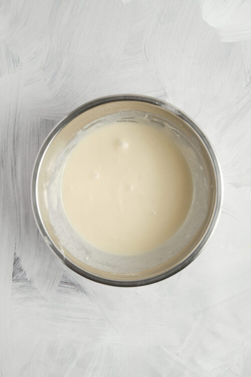 Add the lightly beaten egg, buttermilk, honey, and vegetable oil to the dry ingredients. Stir until just combined, and let the batter rest for 10 minutes.