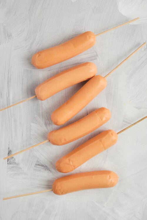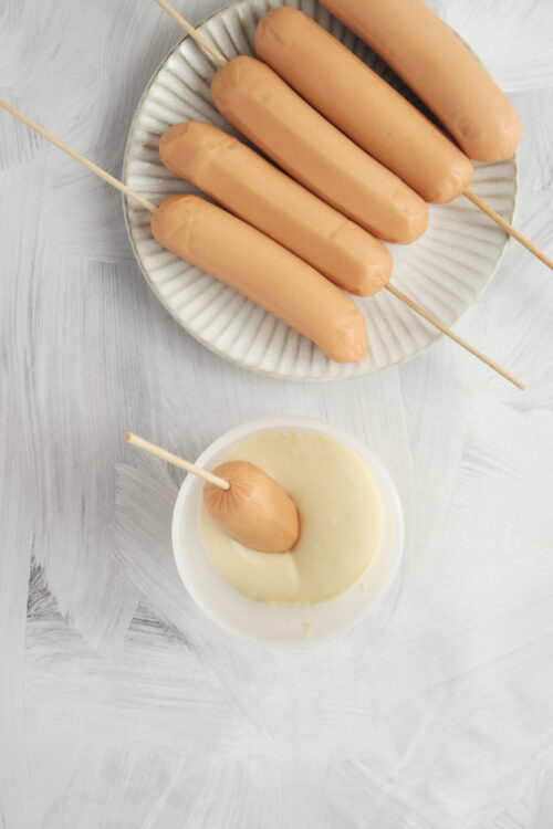 Pat the hot dogs dry with a paper towel and insert a wooden skewer into each one. Pour the batter into a tall cup.