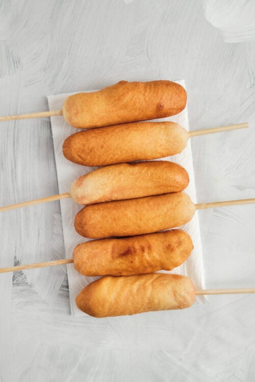 Heat enough vegetable oil in a deep pot to 350°F. Dip each hot dog into the batter, allowing any excess to drip off, then carefully lower them into the hot oil.