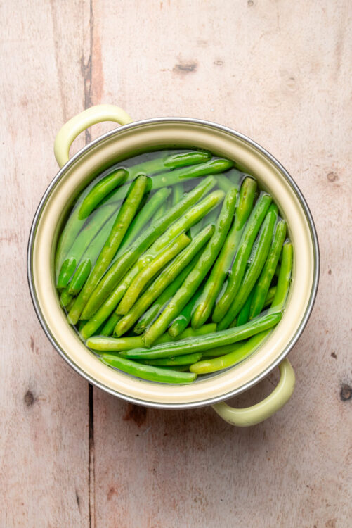Bring a large pot of water to a boil. Add 1/2 teaspoon salt and the green beans. Blanch for 3-4 minutes until the beans turn bright green and tender-crisp. Drain and rinse with cold water to stop cooking.