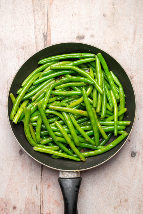 Add the minced garlic to the skillet and cook for about 30 seconds until lightly golden. Add the blanched green beans, then season with kosher salt and ground black pepper.