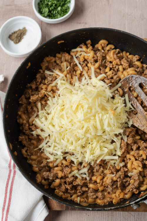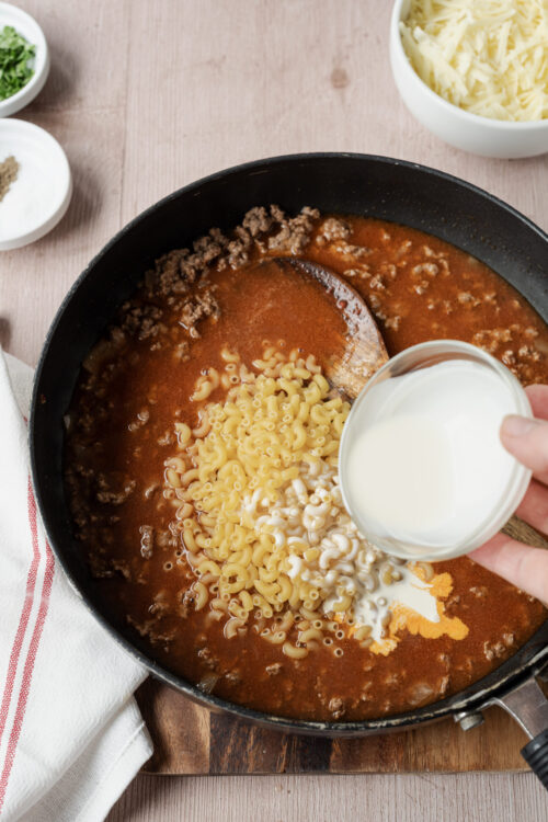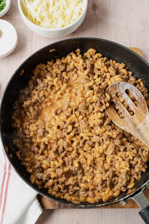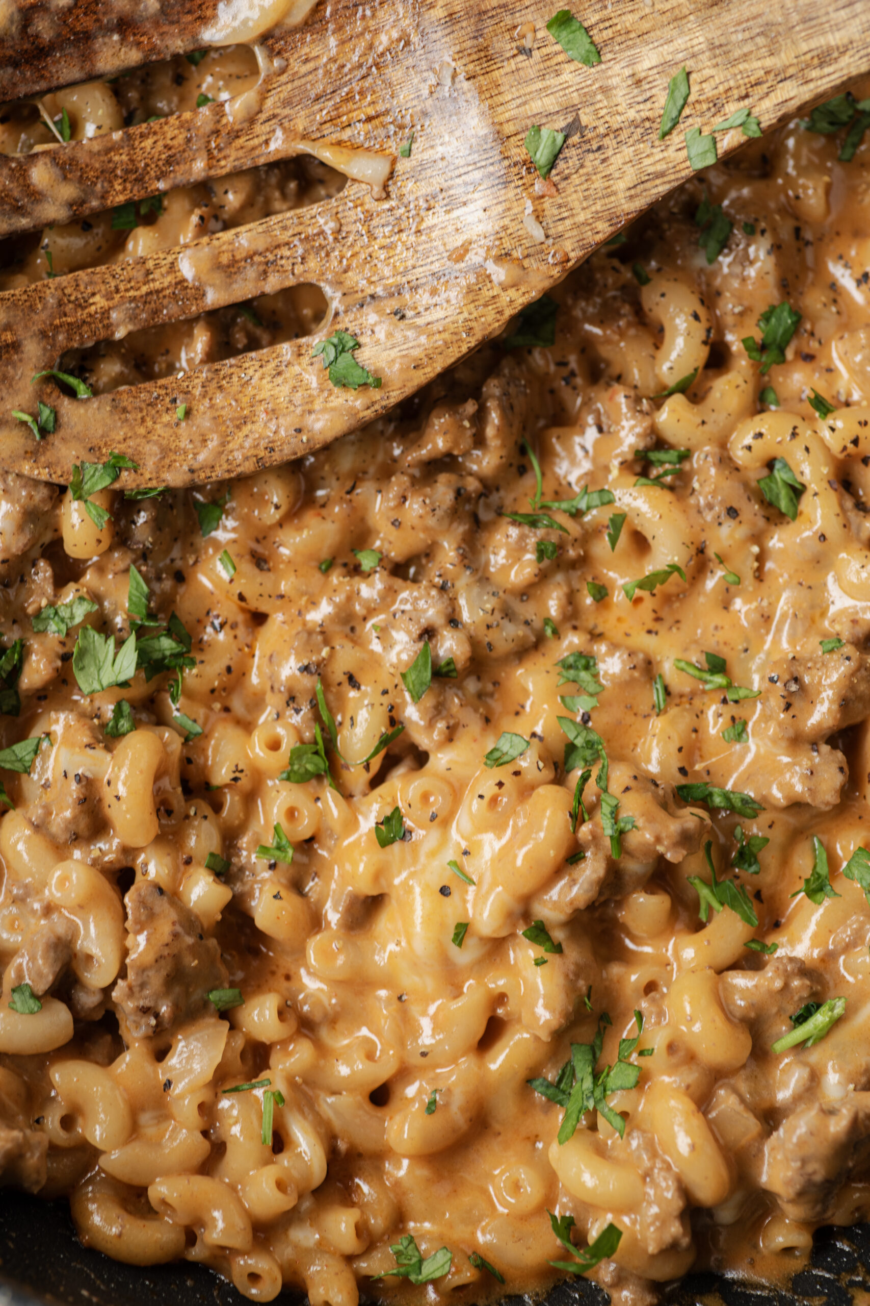 Each bite has the perfect blend of tender macaroni, rich ground beef, and luscious melted cheddar. What more could you ask for in a meal that’s made to satisfy? Oh, and did I mention that it’s all made in one pan on the stove? That means fewer dishes for you to do and more ease for your creative cooking process.