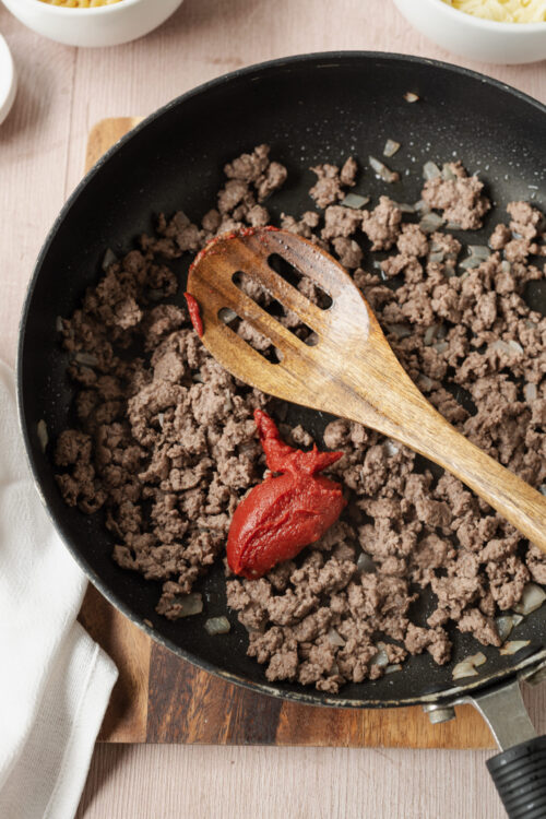 Stir in the tomato paste, garlic powder, and chili powder. Season with salt and pepper.