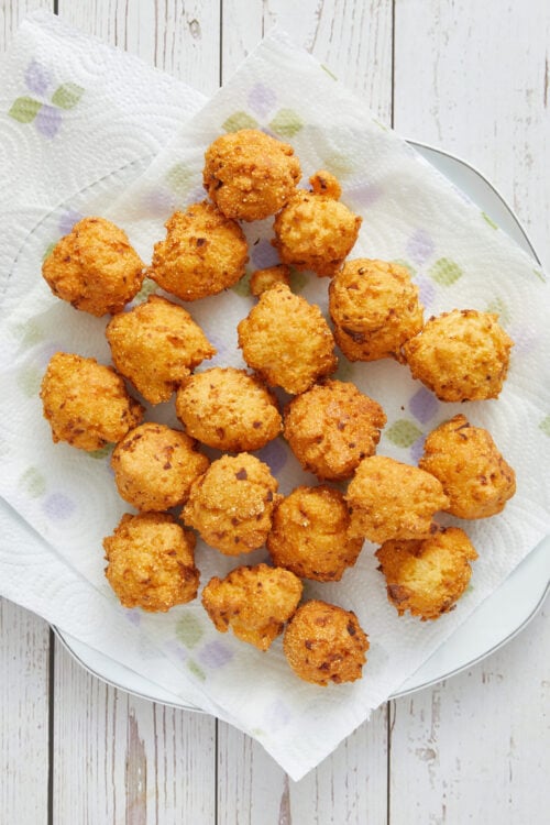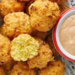 Once they reach room temperature, transfer your hush puppies to an airtight container and refrigerate them for 2 to 3 days. For longer storage, put them in a freezer-safe bag and freeze for up to 2 months. Once thawed, you can reheat them in the oven or air fryer at 350°F for 5 to 10 minutes, until they’re crisp again.