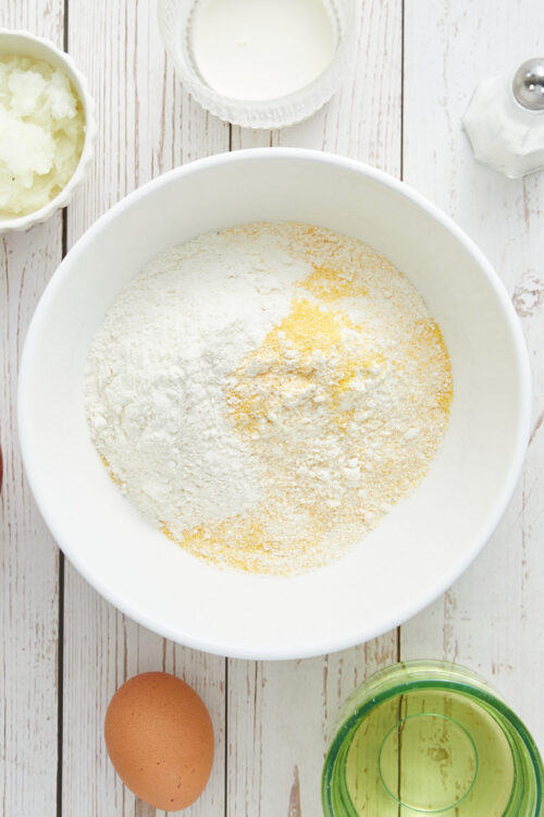 In a medium bowl, whisk together the dry corn muffin mix and self-rising flour.