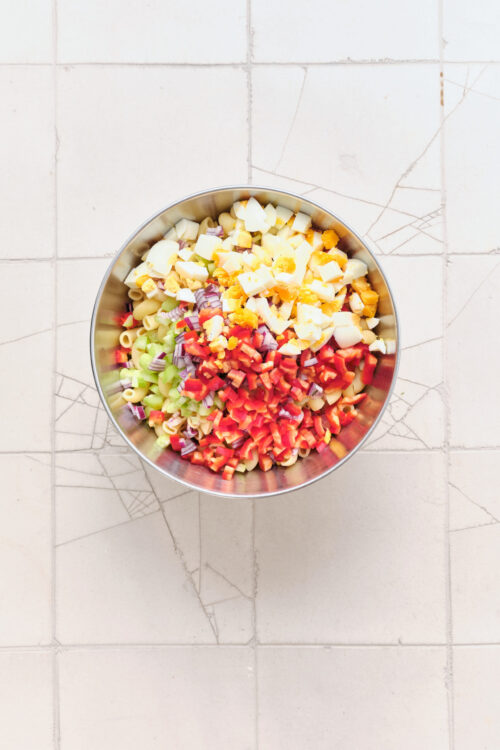 In a large bowl, add the cooled macaroni, diced celery, red bell pepper, red onion, and chopped hard-boiled eggs.