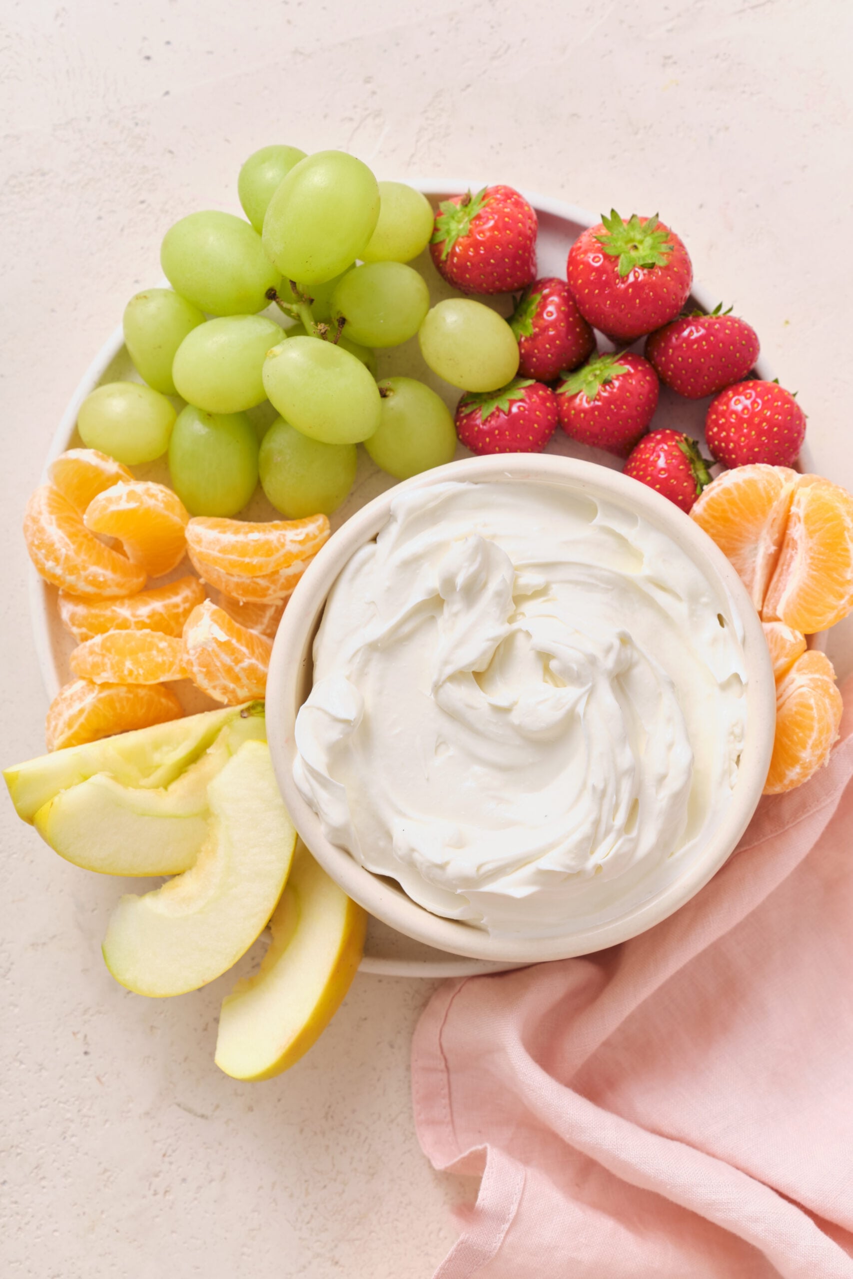 As a simple but rich blend of cream cheese and marshmallow creme, this light and airy dip is ideal for any kind of fruit. Berries, oranges, pears, apples, and even tropical fruits like starfruit or pineapple go beautifully with this spread. My favorite aspect of it is how customizable it is. Sure, this classic vanilla version is iconic and delightful for all kinds of fruits. But if you add a teaspoon of cinnamon or a tablespoon of cocoa powder, you can completely transform it.