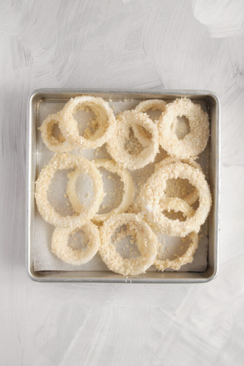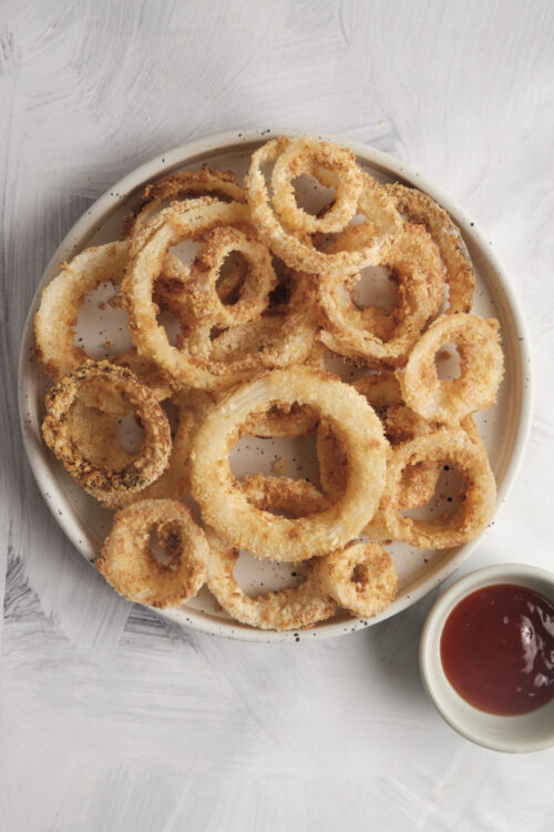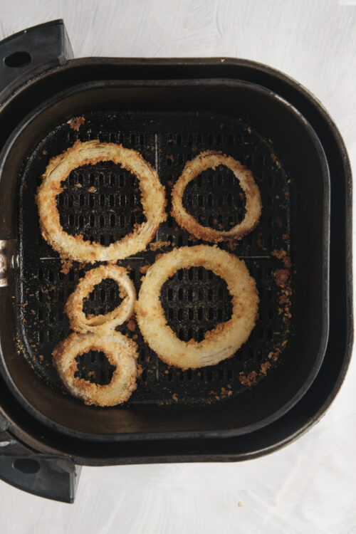 Once they reach room temperature, store your leftover onion rings in an airtight container and refrigerate them for 3-5 days. Reheat in the air fryer at 375°F for 5-10 minutes, until they’re crisp again. For longer storage, flash-freeze them for 1 hour on a baking tray, then put them in a freezer-safe bag and freeze for 2-3 months. Then reheat them in the same way, but for slightly longer, about 10-15 minutes.