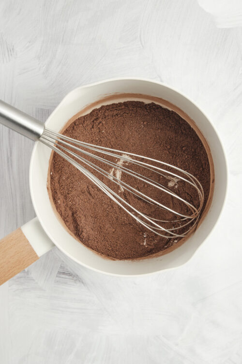 Meanwhile, in a medium saucepan, whisk together sugar, cocoa powder, and flour until smooth.