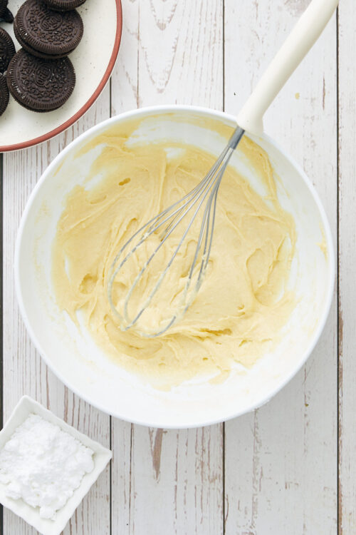 The next thing I love about this recipe is that it uses staple ingredients we often have on hand—things like milk, butter, eggs, vanilla, pancake mix, and sandwich cookies. If you have these ingredients, one bowl, a whisk, parchment paper, and an air fryer, you have all you need to make a delicious dessert for your family. Of course, no one would blame you if you whipped up a batch just for yourself. I can’t think of a better snack to enjoy while curled up on the couch watching my favorite rom-com.